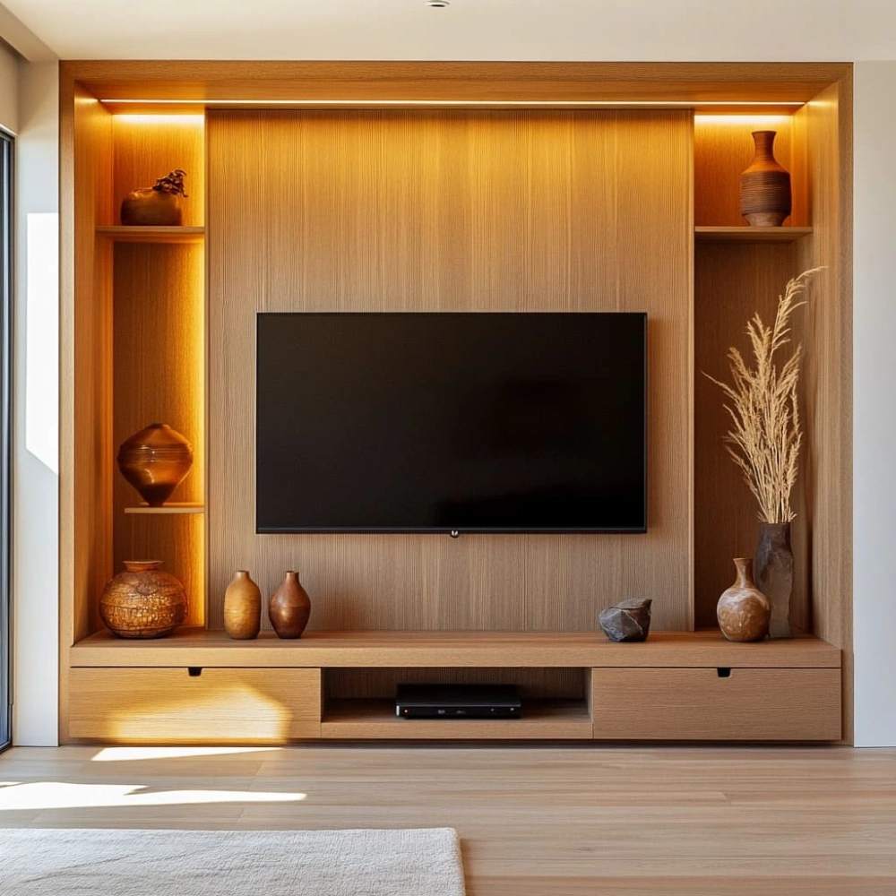 Sleek Natural Wood Finish Media Wall, Integrated warm white LED strip lights enhance the TV area and create a cozy, ambient glow. Display décor, books, or media accessories with stylish open shelving that adds character and depth. Modern, sleek design for apartments and villas Combines aesthetics with practical storage Customizable in size, finish, and configuration Perfect focal point for living rooms and lounge areas. Fully customizable in size, colors, and finishes Dimensions 240×300 cm